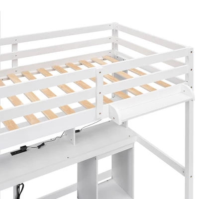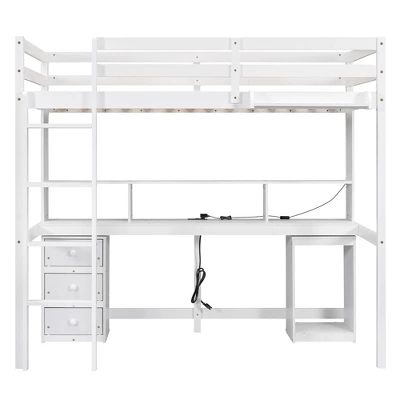 This versatile loft bed can meet your every need. Storage shelves, 1 cabinet, 3 drawers and 1 bedside tray provide ample storage space. The built-in desk comes with 2 standard plug sockets and 2 USB ports for your entertainment or study convenience. This loft bed comes with LED lights, perfect for your colorful nightlife. This bed is the perfect finishing touch to your bedroom.