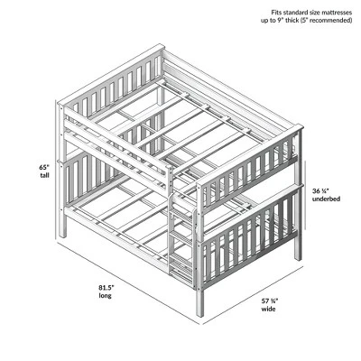 Plenty of room for sleep and play? Now that’s a win-win! The Max & Lily Full Over Full Bunk Bed is the perfect combination of functional and fun that both kids and parents love. Top bunk features tall 14” guardrails, so the bed safely fits standard mattress sizes. Angled ladder with rounded edges offers comfortable, easy climbing. Added bonus – ladder is both reversible and removable, so it is flexible to work with any space. Solid, knot-free New Zealand pine wood adds strength and stability. All Max & Lily products use a durable, low VOC finish. The slatted head and footboards and flush, color-matched hardware give this bunk bed a clean, modern look. Instructions, upper/lower slat rolls, and required hardware are included. With solid plywood slats and a metal support bar for the top bunk, each sleeping surface can support 400 pounds of resting weight. This bed meets or exceeds Federal safety standards for kids furniture. When it’s time for play, this bunk bed’s space saving design frees up plenty of floor space by stacking two sleeping surfaces. Add storage drawers or trundle to make this bed even more functional. 2+ adults make assembly simple and easy. The Full Over Full Bunk Bed from Max & Lily offers exceptional quality and affordability that kids and their parents will enjoy for years to come. Max & Lily is a member of the Maxwood family of brands – the kids furniture experts bringing a tradition of superior quality, safety and fun!