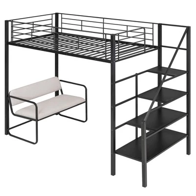 Keep your little child or teen’s room clean and safe with a steel frame loft bed, featuring a built-in bench and stairway shelves to keep things tidy. This piece showcases heavy-duty construction that is coated in matte black and keeps your little one’s room clean and modern looking. Combining rest and functions, this loft bed will become a popular item in your bedroom.